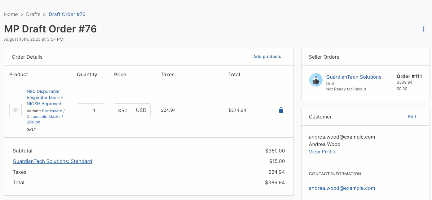 Marketplace operators can now edit product line item prices for draft and quote orders. This feature requires enabling price overrides on the product type. Prices can be modified until the draft or quote order is finalized.