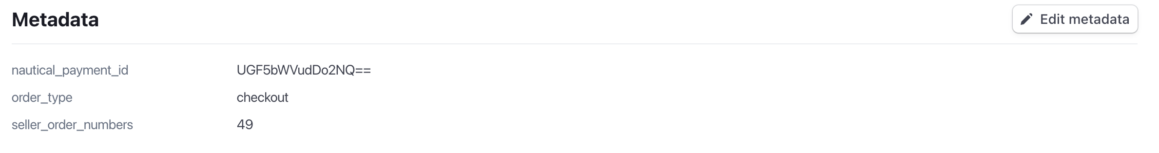Traide sends the order data to Stripe. You can view the order data in the Stripe payment record. The payment description sent to Stripe includes the marketplace order number and the customer email address. The Metadata section shows the seller order number(s) and other metadata: