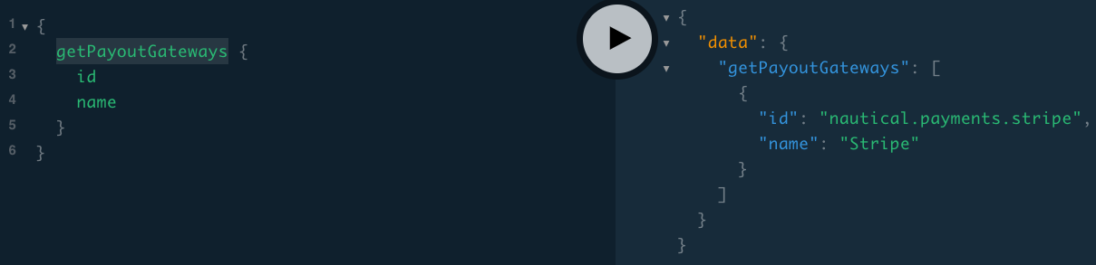 As mentioned at the beginning of this Document, it is assumed that the marketplace is using Stripe Connect for their payouts. As such, we'll grab the “nautical.payments.stripe”, from this query response. This will be used as our gateway value when we run the vendorPayoutsBulkProcess mutation.