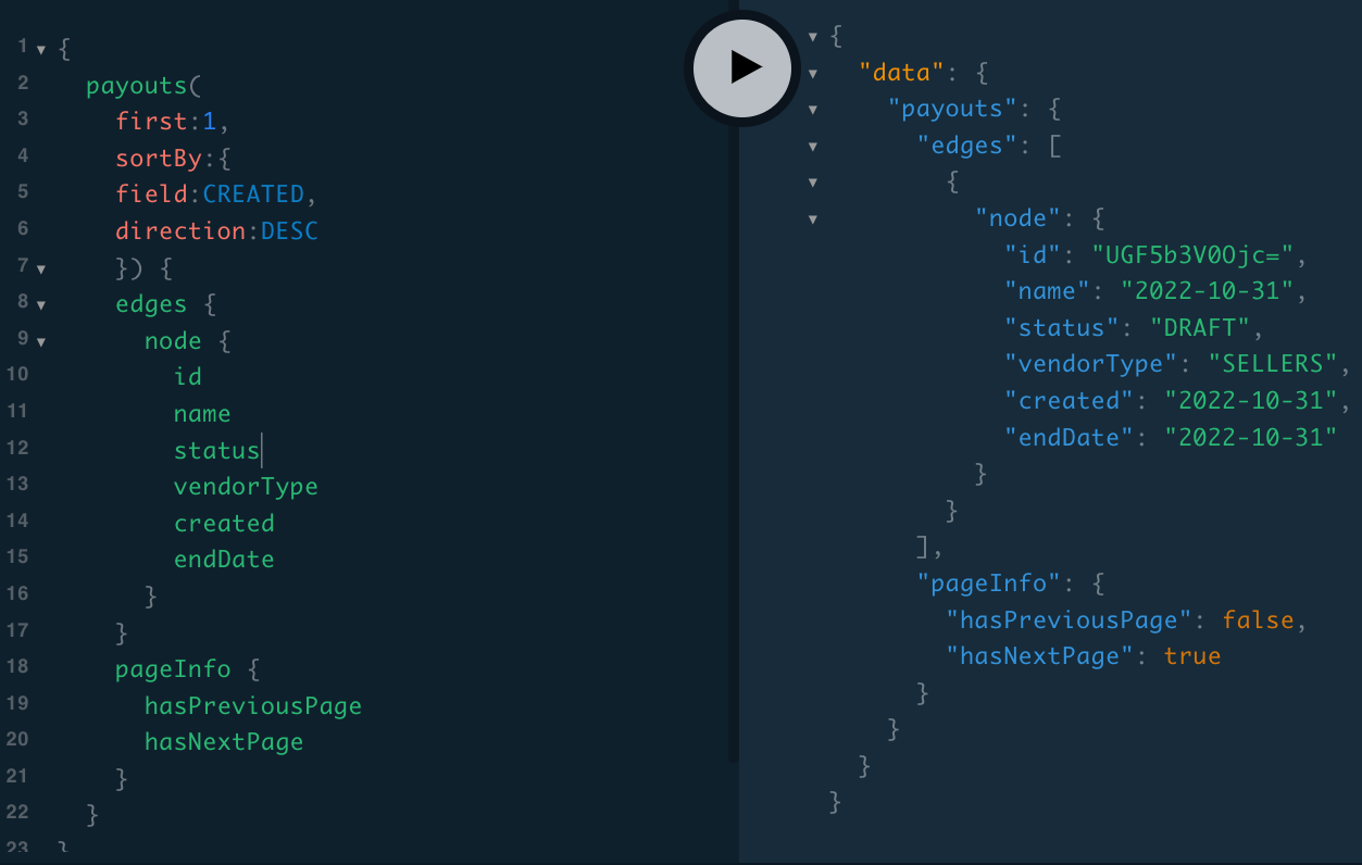 If we want to get some details about one of our Payouts (past or present), we can do so through the payout mutation, which needs the Payout ID for the Payout of interest. The Draft Payout we just created above has an ID of “UGF5b3V0Ojc=”. Here is an example of some of the data we can query for this Payout (see GraphQL playground documentation for an exhaustive list of fields you can query for):
