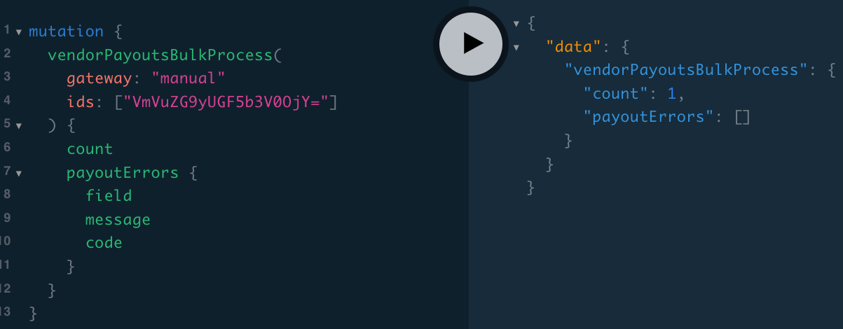 With this in hand, the mutation to exclude Sellers from a given payout is vendorPayoutsBulkExclude. It takes an argument of ids, which is an array of the vendorPayout IDs that we wish to exclude.